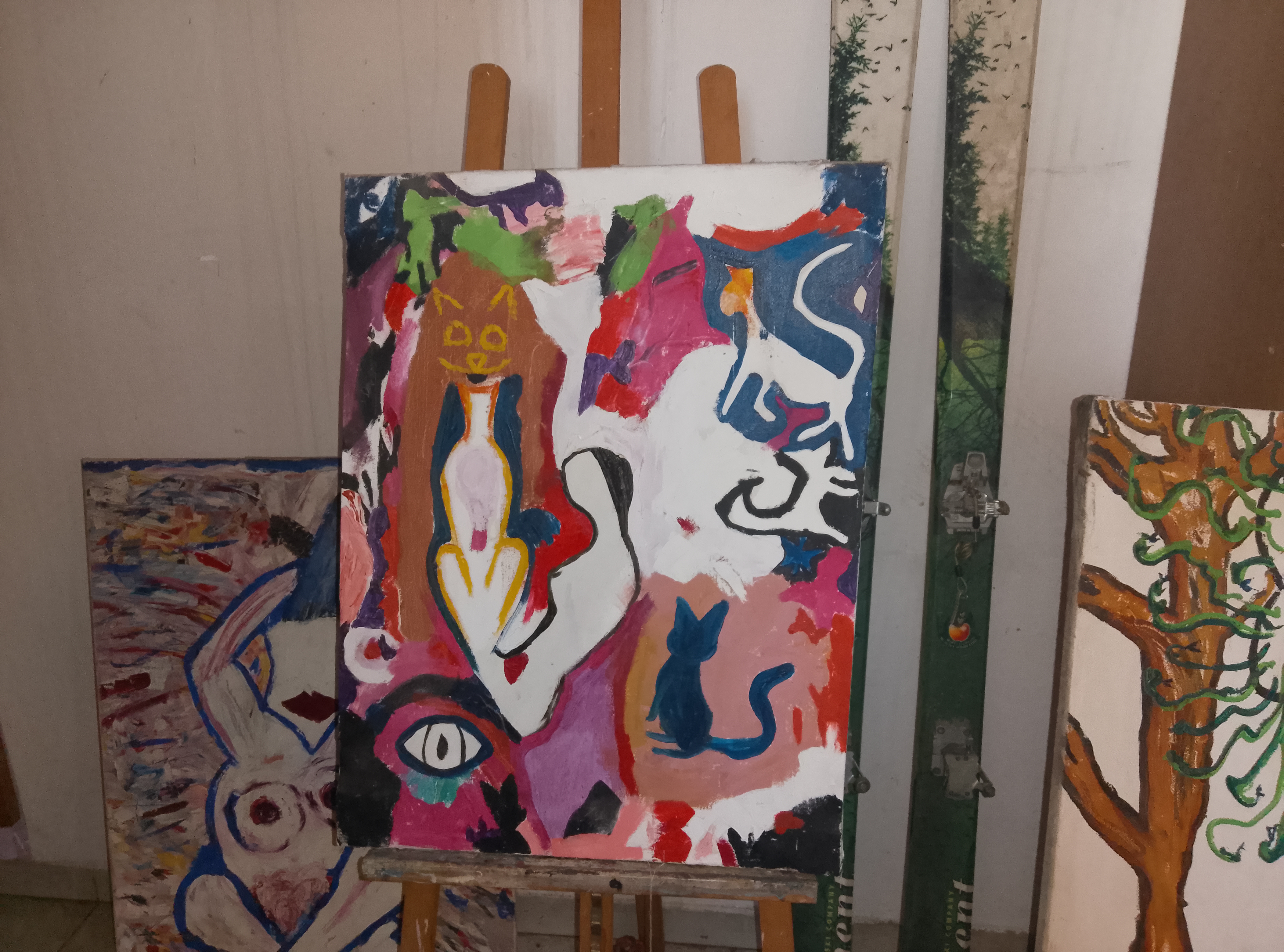 This artwork is a profound visual puzzle, intentionally layered with many hidden images. As the viewer delves deeper, figures of women emerge from the canvas, cats subtly reappear, a majestic horse takes shape, and a singular eye of the watcher observes from within the composition's depths. Rendered in a spectrum of bright, expressive colors, the painting simultaneously sings with the intensity of passion and the purity of innocence, creating a profound dialogue between overt beauty and concealed narratives.